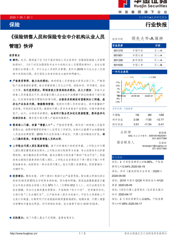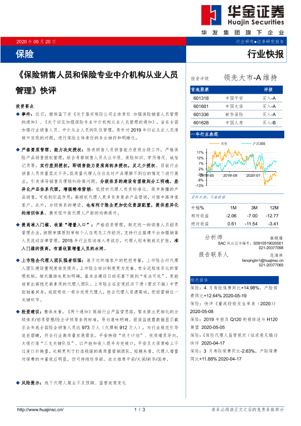【华金证券】【20200520】保险销售人员和保险专业中介机构从业人员管理快评-3页