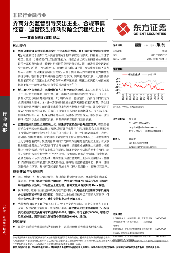 【东方证券】【20200524】非银金融行业周观点:券商分类监管引导突出主业、合规审慎经营,监管鼓励推动财险全流程线上化-12页
