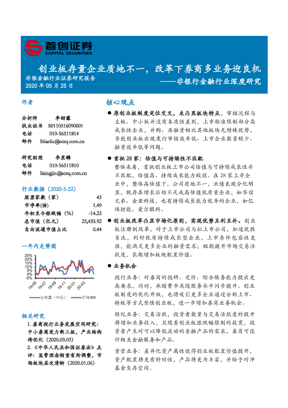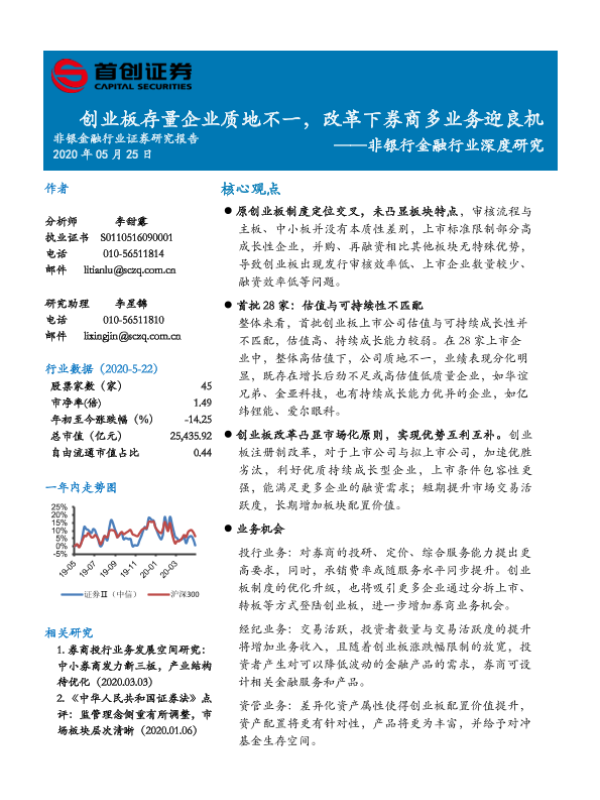 【首创证券】【20200525】非银行金融行业深度研究:创业板存量企业质地不一,改革下券商多业务迎良机-21页