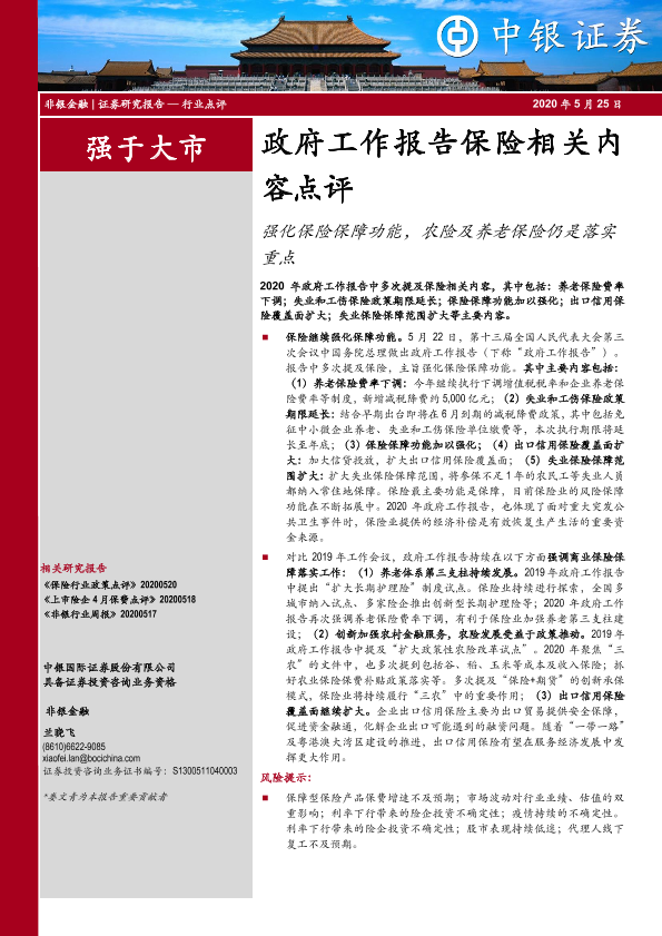 【中银证券】【20200525】政府工作报告保险相关内容点评:强化保险保障功能,农险及养老保险仍是落实重点-5页