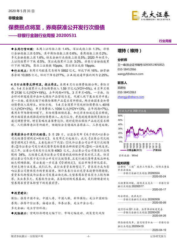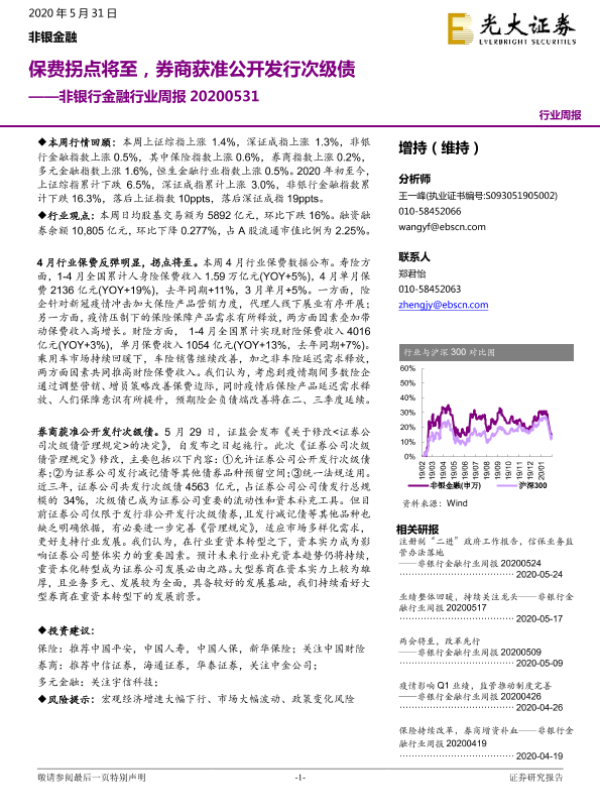 【光大证券】【20200531】非银行金融行业周报:保费拐点将至,券商获准公开发行次级债-14页