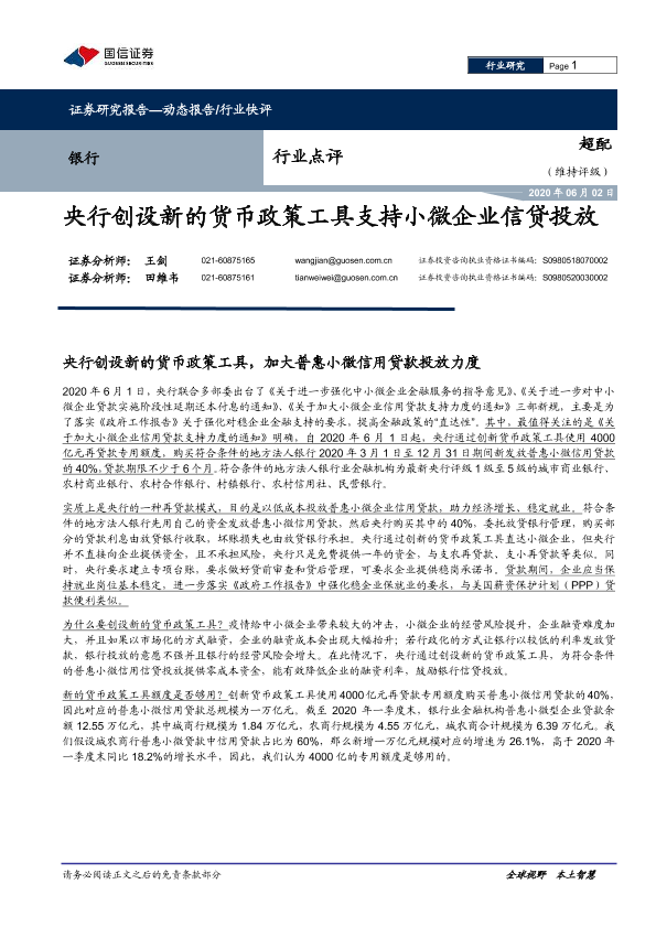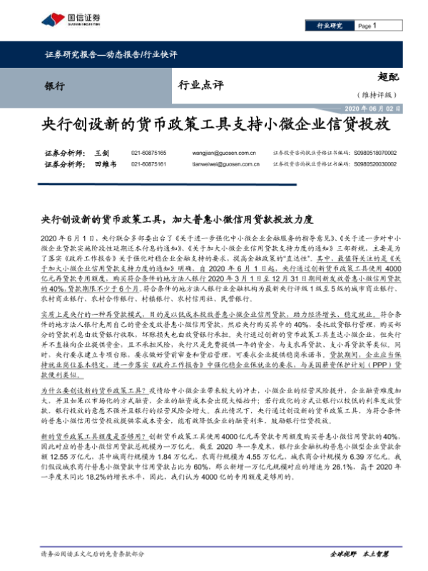 【国信证券】【20200602】银行行业点评:央行创设新的货币政策工具支持小微企业信贷投放-5页