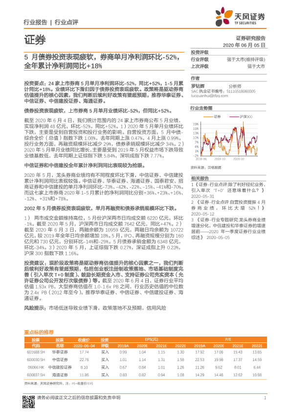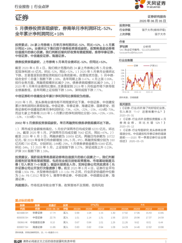 【天风证券】【20200605】证券行业点评:5月债券投资表现疲软,券商单月净利润环比-52%,全年累计净利润同比+18%-5页