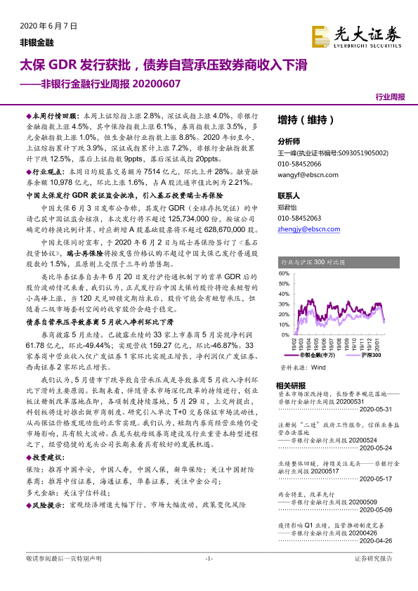 【光大证券】【20200607】非银行金融行业周报:太保GDR发行获批,债券自营承压致券商收入下滑-14页