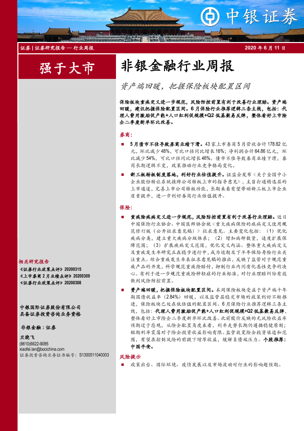 【中银证券】【20200611】非银金融行业周报:资产端回暖,把握保险板块配置区间-10页