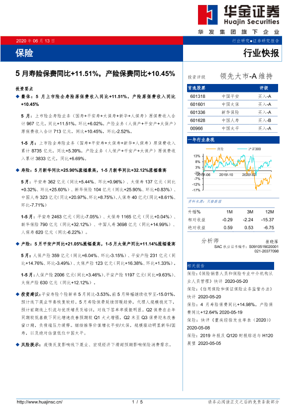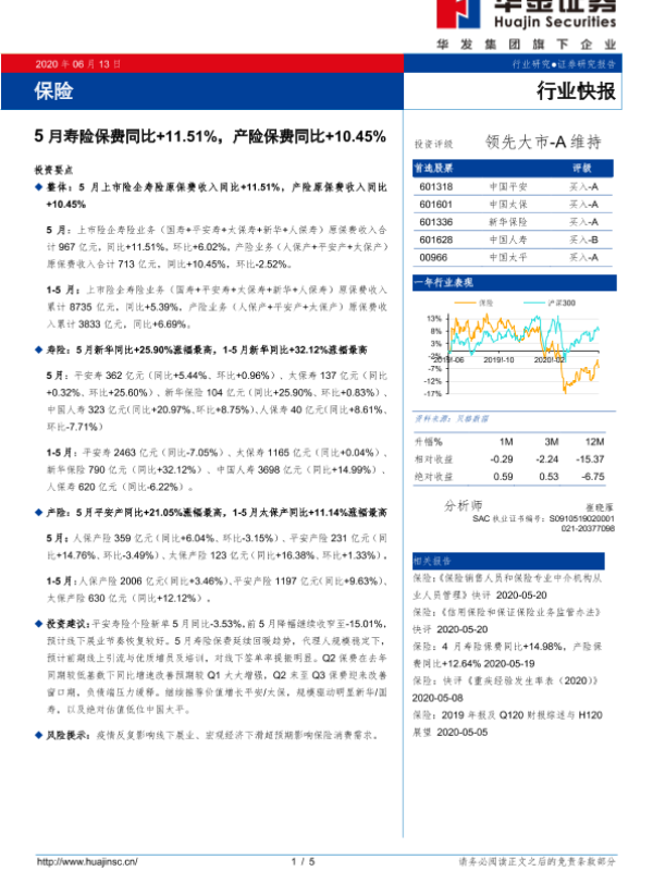【华金证券】【20200613】5月寿险保费同比+11.51%,产险保费同比+10.45%-5页