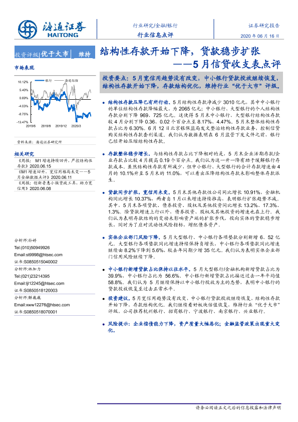 【海通证券】【20200616】银行5月信贷收支表点评:结构性存款开始下降,贷款稳步扩张-3页