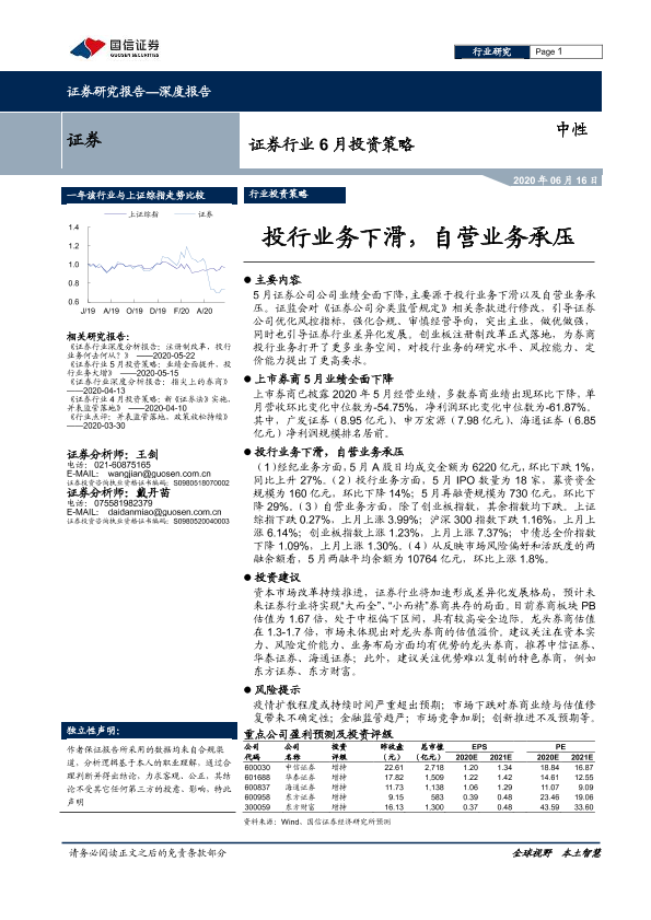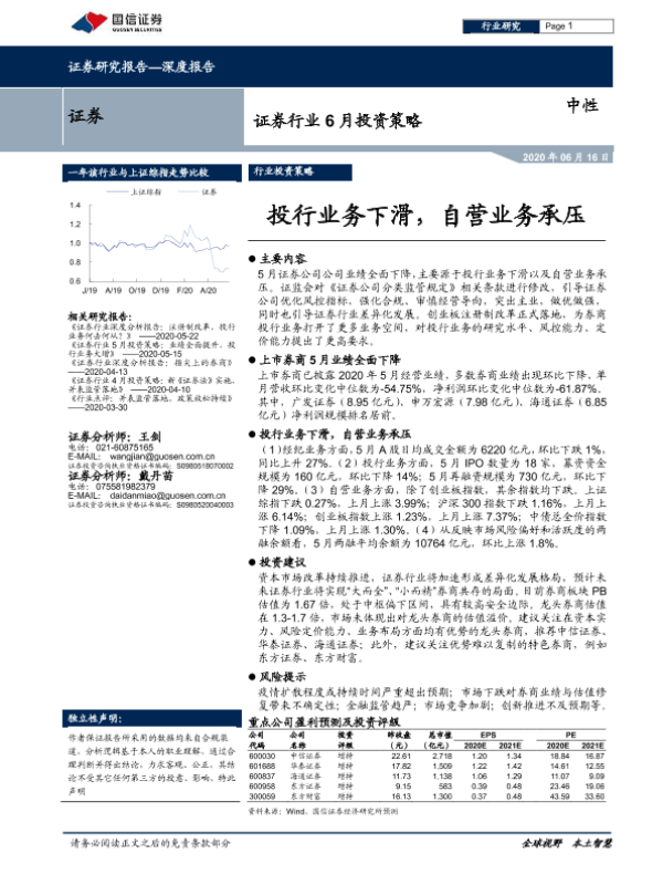 【国信证券】【20200616】证券行业6月投资策略:投行业务下滑,自营业务承压-8页