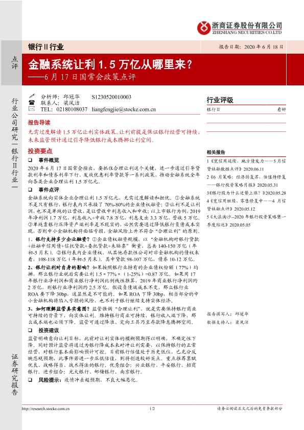 【浙商证券】【20200618】银行Ⅱ行业6月17日国常会政策点评:金融系统让利1.5万亿从哪里来?-2页
