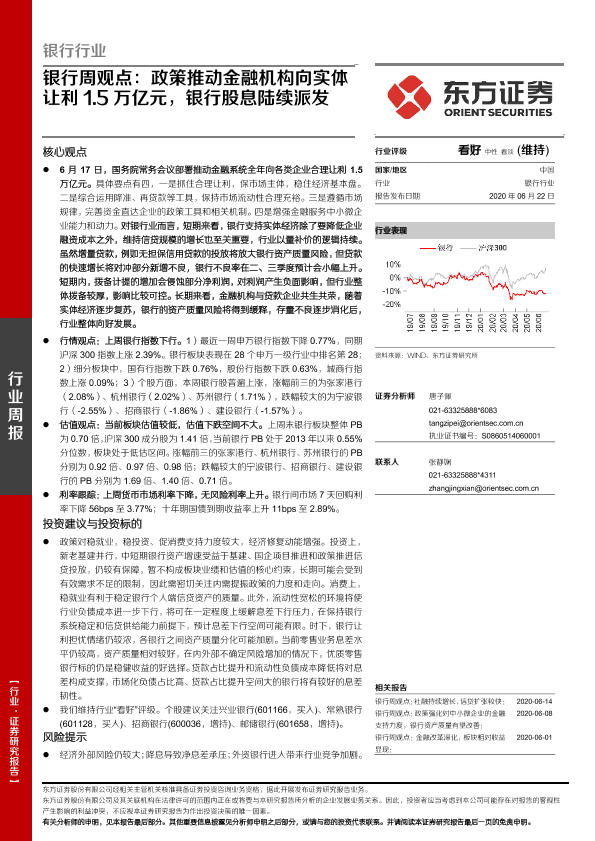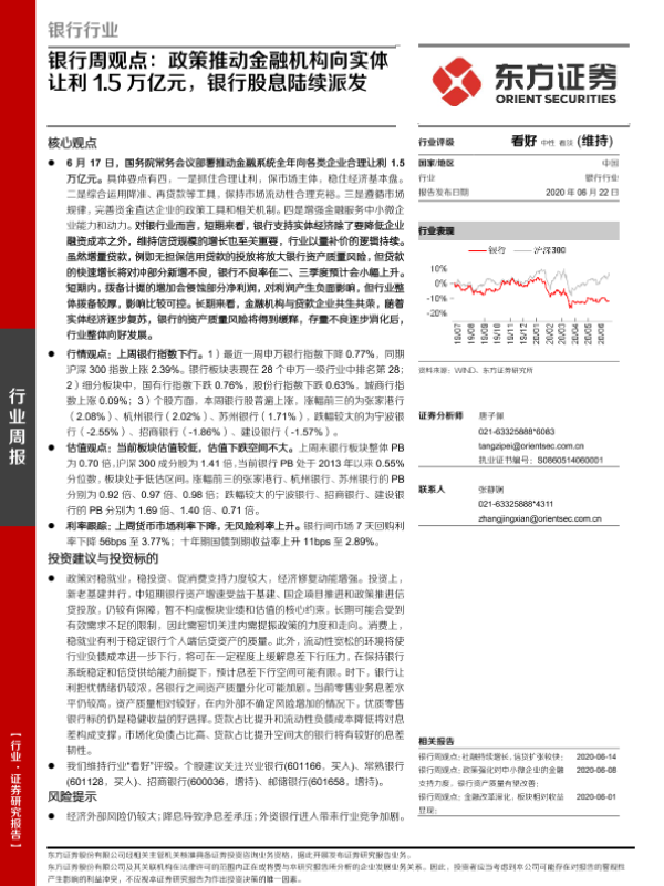 【东方证券】【20200622】银行周观点:政策推动金融机构向实体让利1.5万亿元,银行股息陆续派发-17页