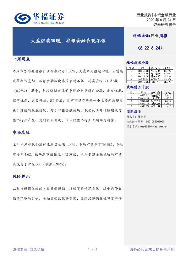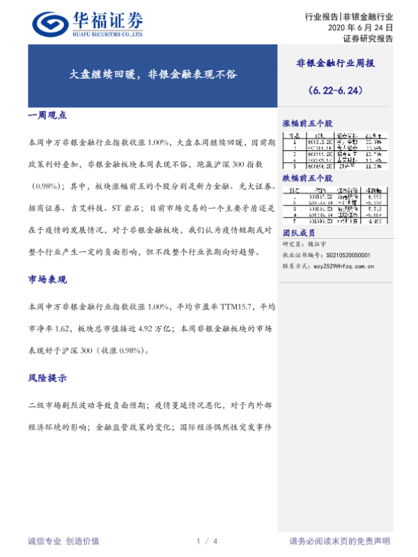 【华福证券】【20200624】非银金融行业周报:大盘继续回暖,非银金融表现不俗-4页