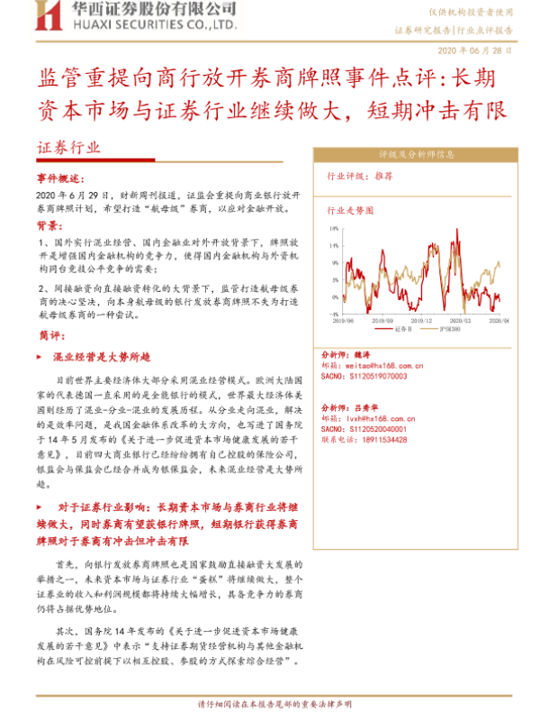 【华西证券】【20200628】监管重提向商行放开券商牌照事件点评:长期资本市场与证券行业继续做大,短期冲击有限-6页