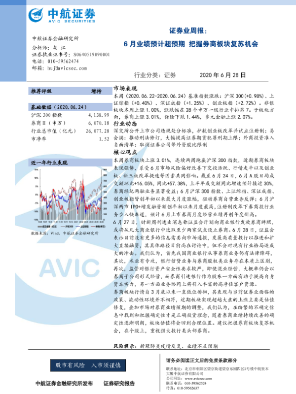 【中航证券】【20200628】证券业周报:6月业绩预计超预期 把握券商板块复苏机会-12页
