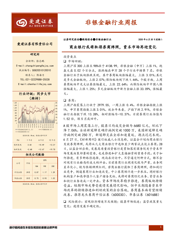 【爱建证券】【20200630】非银金融行业周报:商业银行或将取得券商牌照,资本市场再迎变化-11页