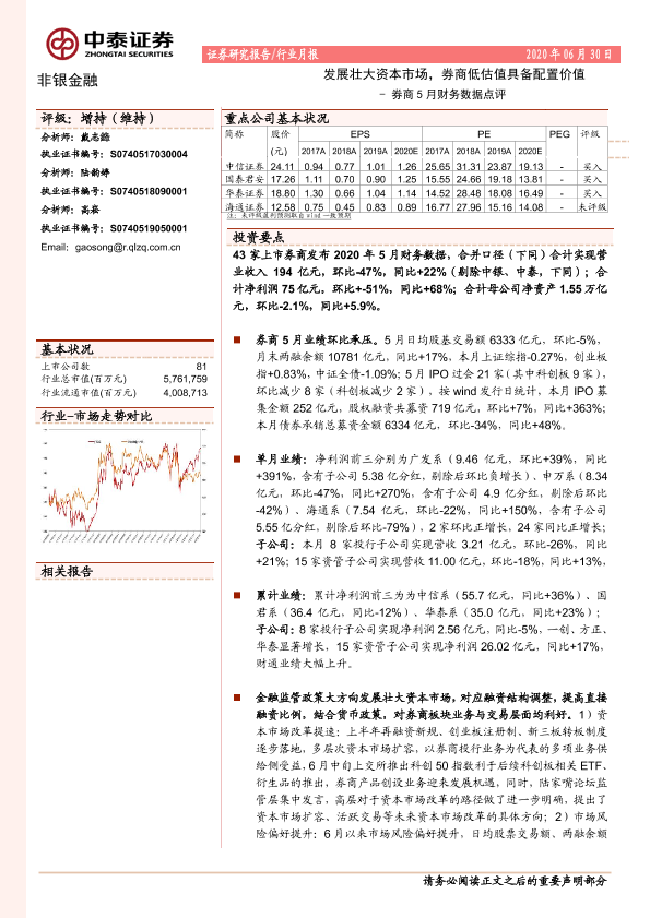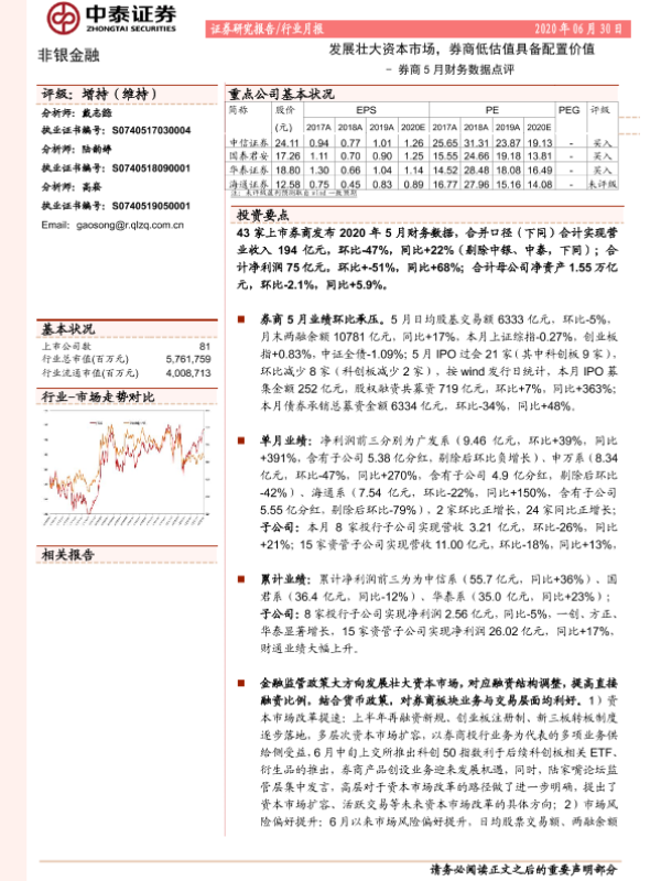 【中泰证券】【20200630】券商5月财务数据点评:发展壮大资本市场,券商低估值具备配置价值-9页
