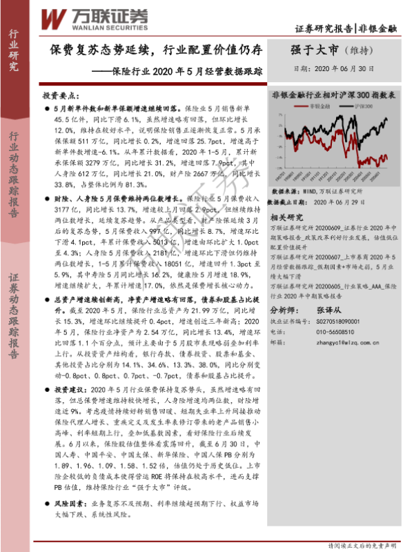 【万联证券】【20200630】保险行业2020年5月经营数据跟踪:保费复苏态势延续,行业配置价值仍存-9页