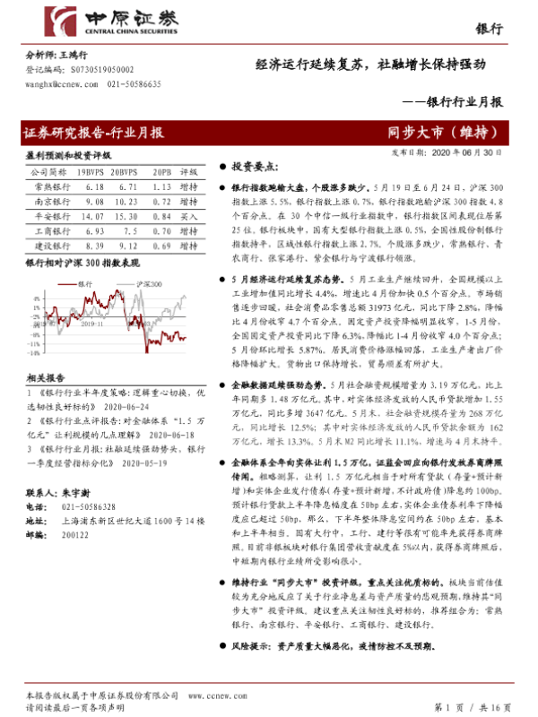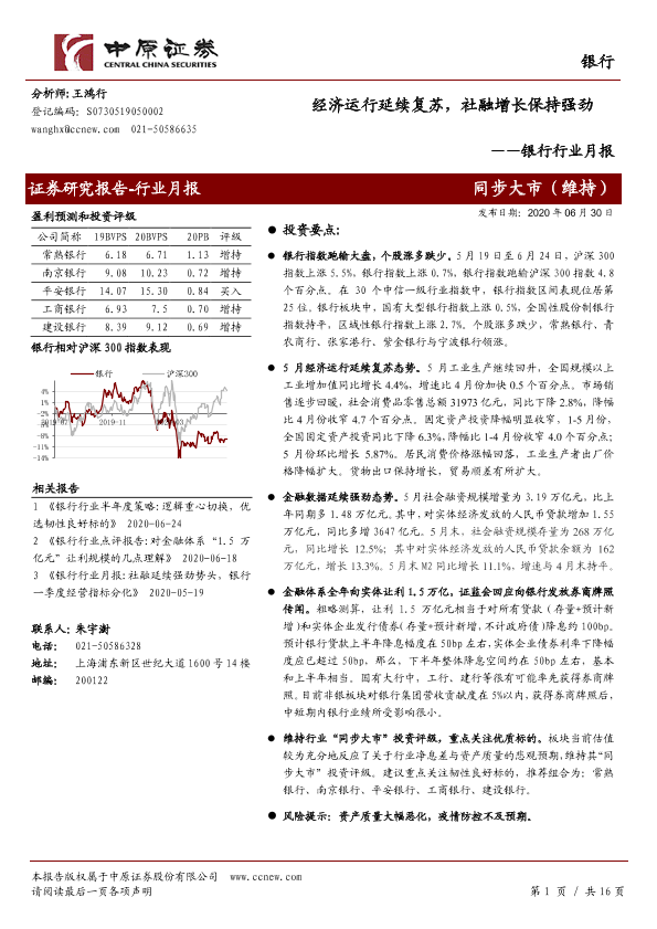 【中原证券】【20200630】经济运行延续复苏,社融增长保持强劲-16页