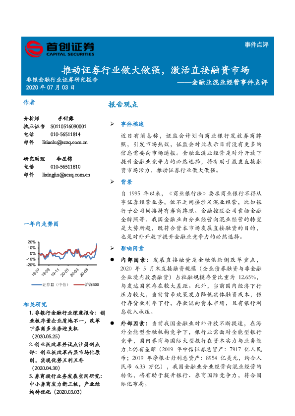 【首创证券】【20200703】金融业混业经营事件点评:推动证券行业做大做强,激活直接融资市场-4页