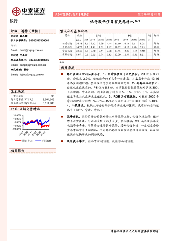 【中泰证券】【20200705】银行行业专题报告:银行股估值目前是怎样水平?-13页