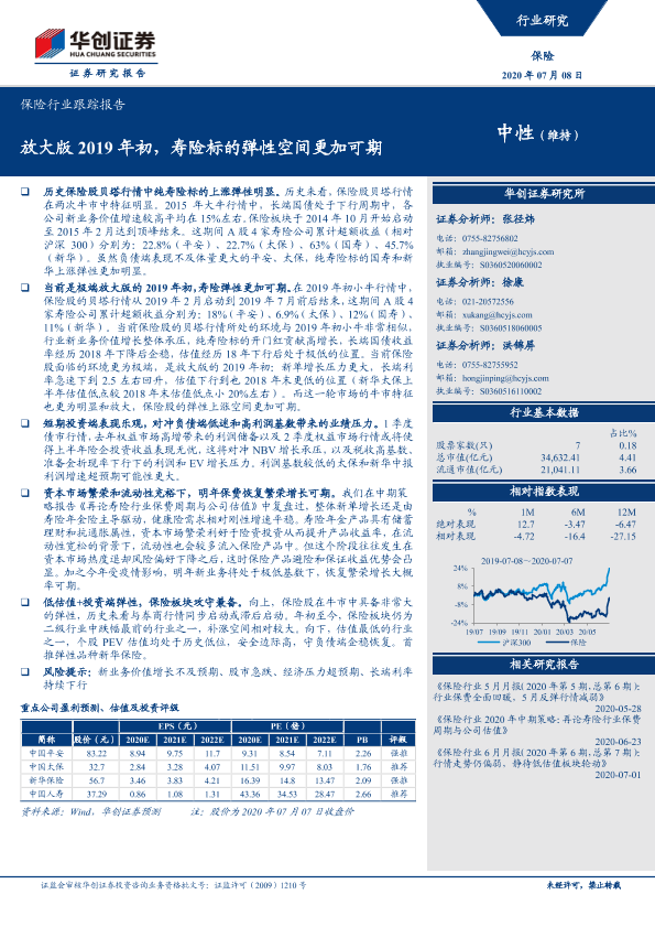【华创证券】【20200708】保险行业跟踪报告:放大版2019年初,寿险标的弹性空间更加可期-6页