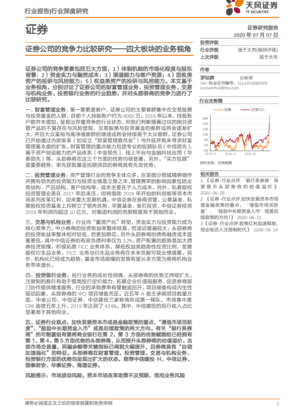 【天风证券】【20200707】证券行业深度研究:证券公司的竞争力比较研究——四大板块的业务视角-70页