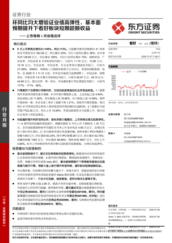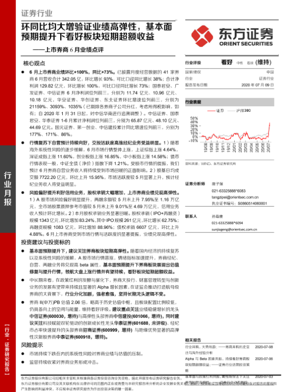 【东方证券】【20200709】上市券商6月业绩点评:环同比均大增验证业绩高弹性,基本面预期提升下看好板块短期超额收益-7页