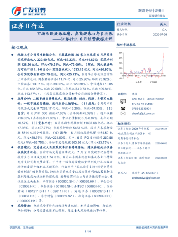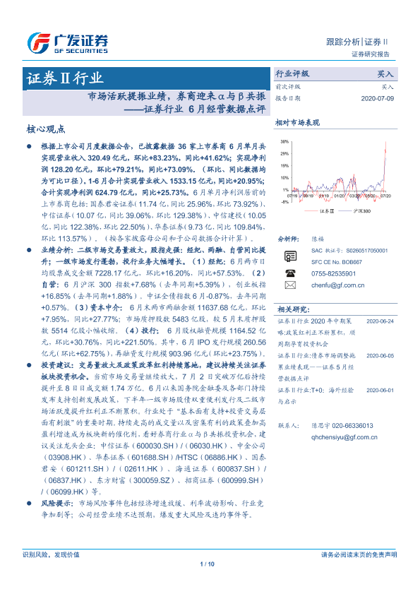 【广发证券】【20200709】证券行业6月经营数据点评:市场活跃提振业绩,券商迎来α与β共振-10页