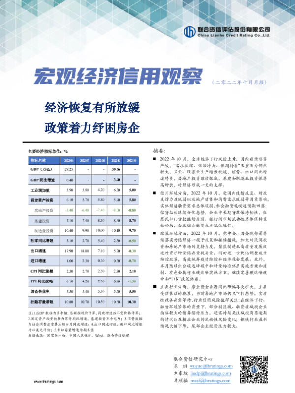 【联合资信】【20221128】宏观经济信用观察(二零二二年十月月报):经济恢复有所放缓 政策着力纾困房企-15页
