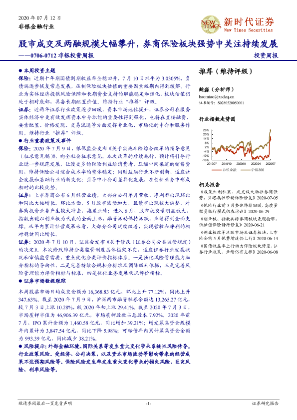 【新时代证券】【20200712】新时代证券-非银投资周报:股市成交及两融规模大幅攀升,券商保险板块强势中关注持续发展-14页