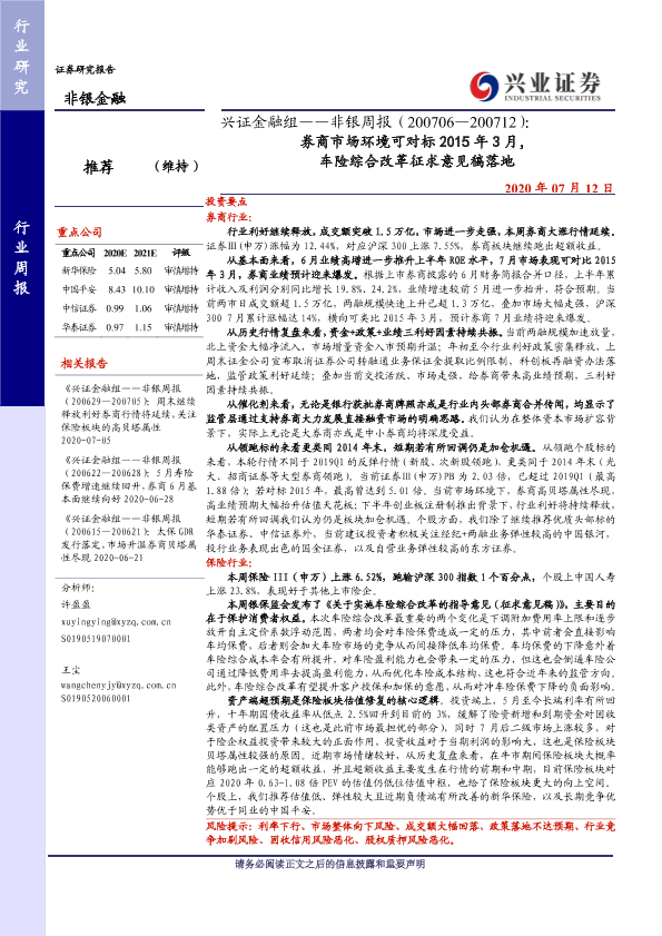 【兴业证券】【20200712】非银周报:券商市场环境可对标2015年3月,车险综合改革征求意见稿落地-12页