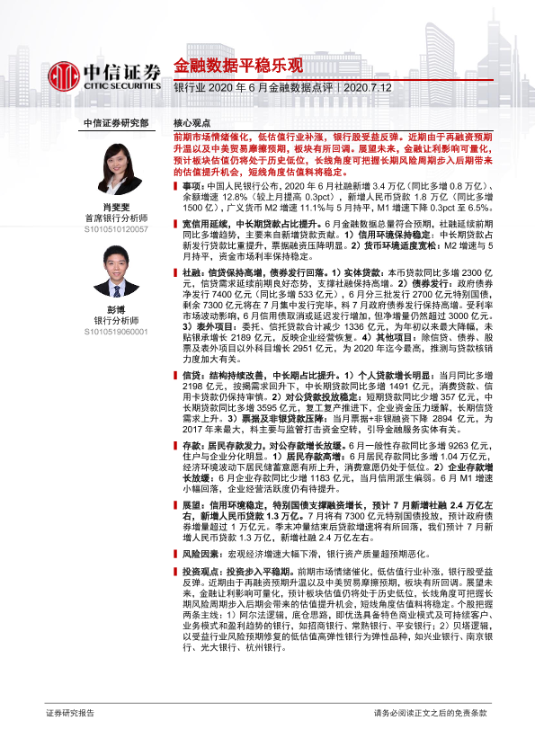 【中信证券】【20200712】银行业2020年6月金融数据点评:金融数据平稳乐观-3页