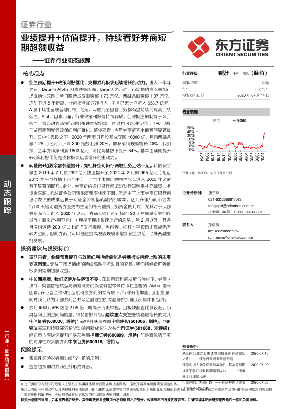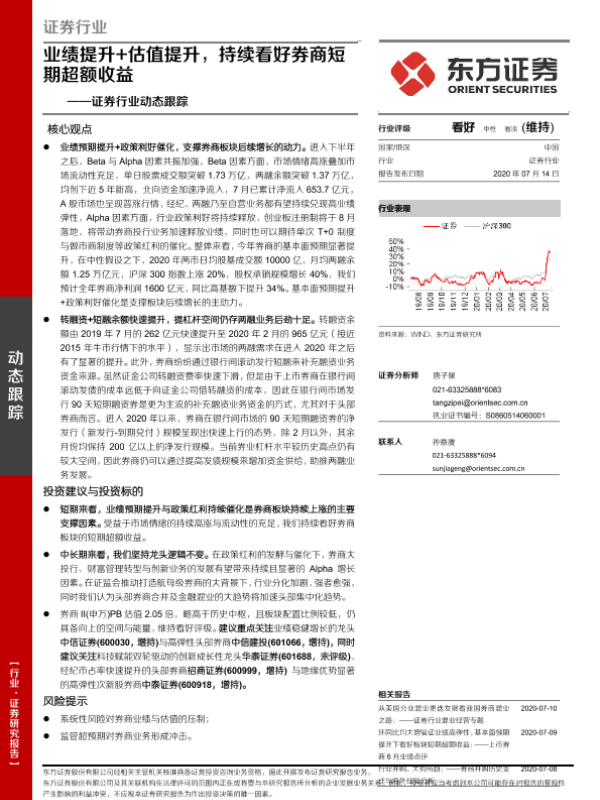 【东方证券】【20200714】证券行业动态跟踪:业绩提升+估值提升,持续看好券商短期超额收益-13页