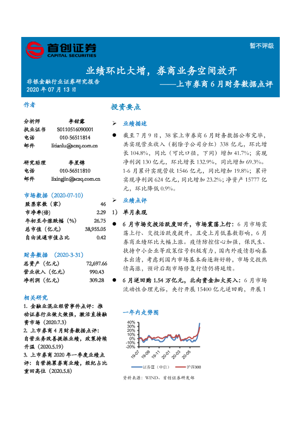【首创证券】【20200713】上市券商6月财务数据点评:业绩环比大增,券商业务空间放开-7页