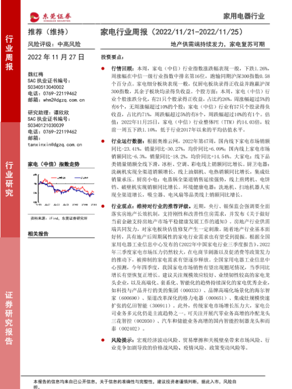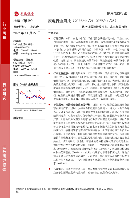 【东莞证券】【20221127】家电行业周报:地产供需端持续发力,家电复苏可期-16页
