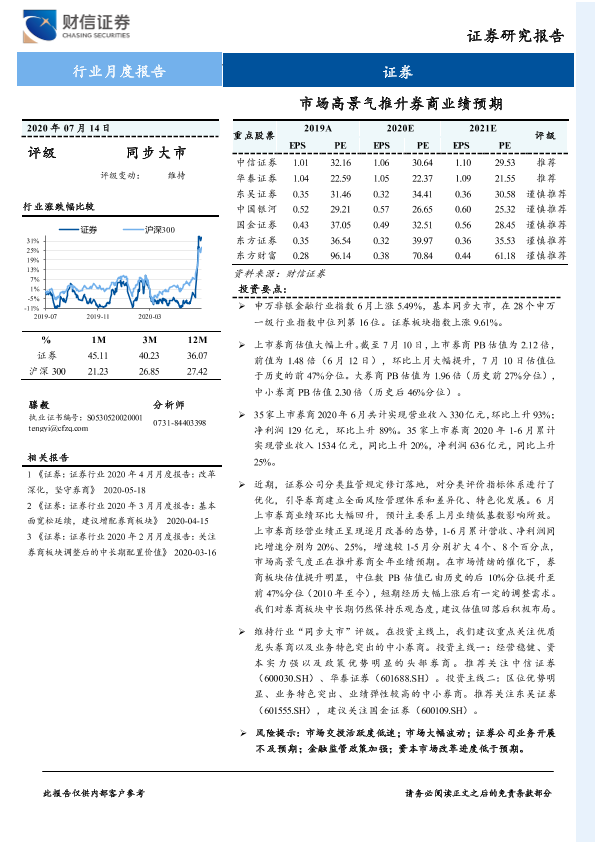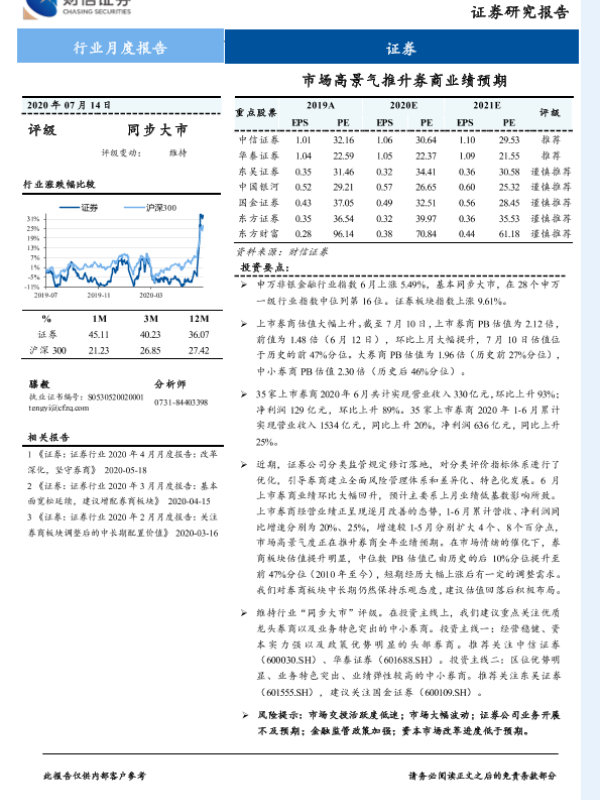 【财信证券】【20200714】证券行业月度报告:市场高景气推升券商业绩预期-12页