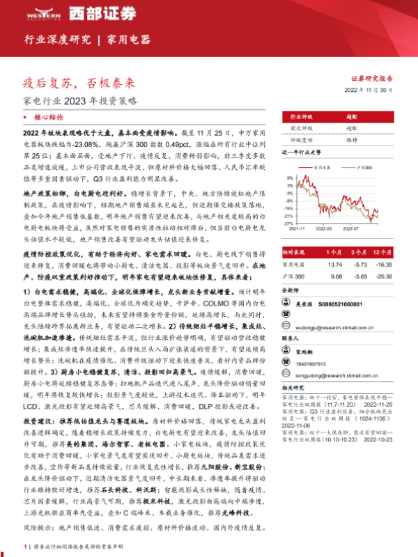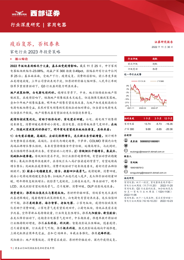 【西部证券】【20221130】家电行业2023年投资策略:疫后复苏,否极泰来-46页
