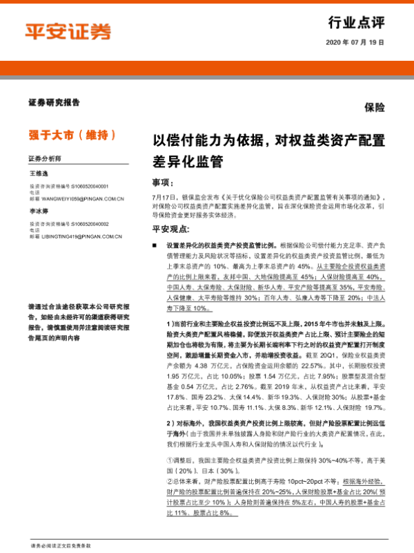 【平安证券】【20200719】保险行业点评:以偿付能力为依据,对权益类资产配置差异化监管-4页