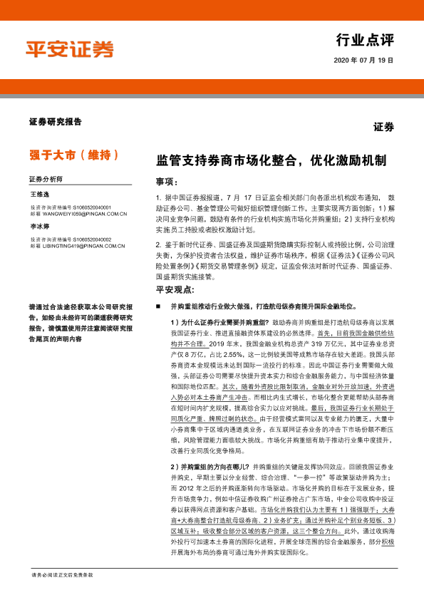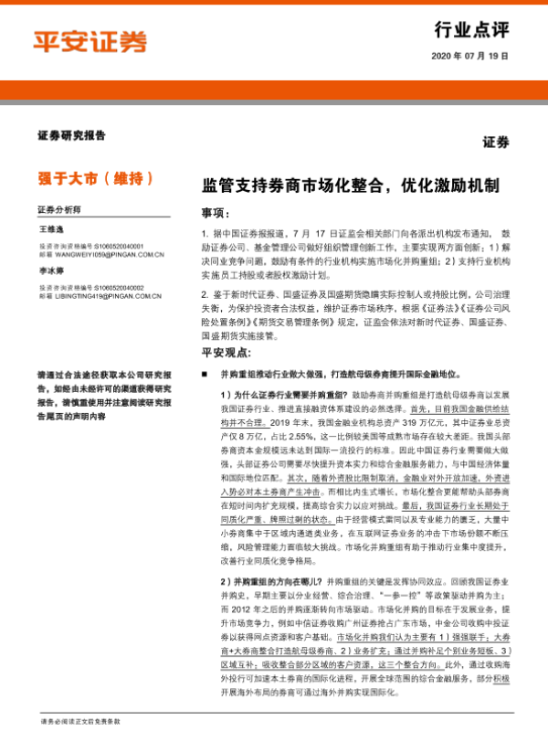 【平安证券】【20200719】证券行业点评:监管支持券商市场化整合,优化激励机制-4页
