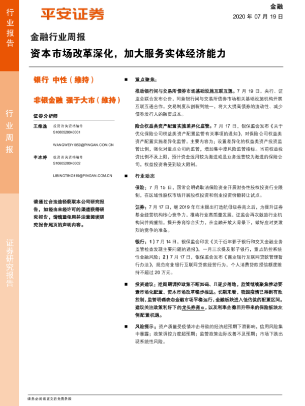 【平安证券】【20200719】金融行业周报:资本市场改革深化,加大服务实体经济能力-9页
