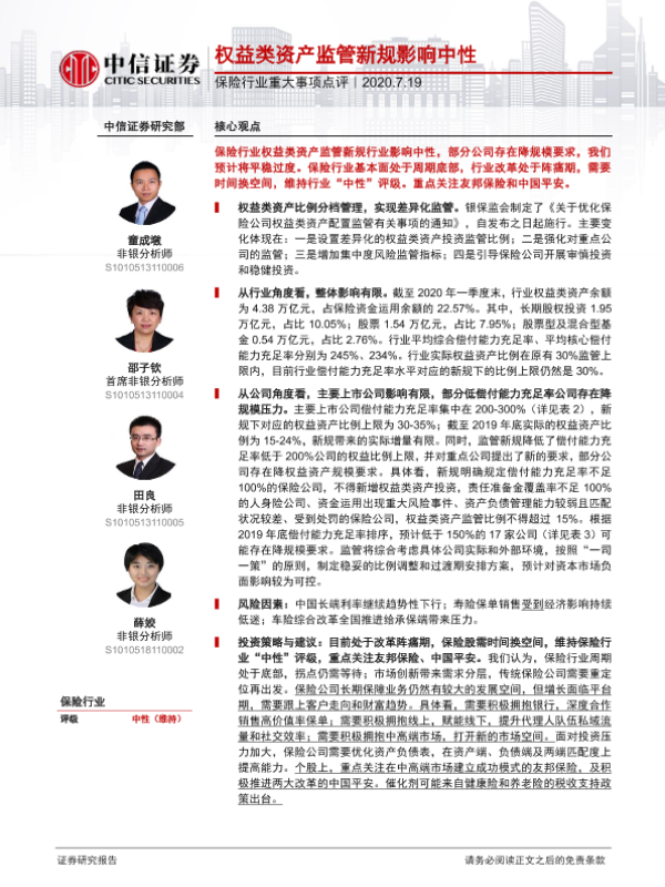 【中信证券】【20200719】保险行业重大事项点评:权益类资产监管新规影响中性-4页