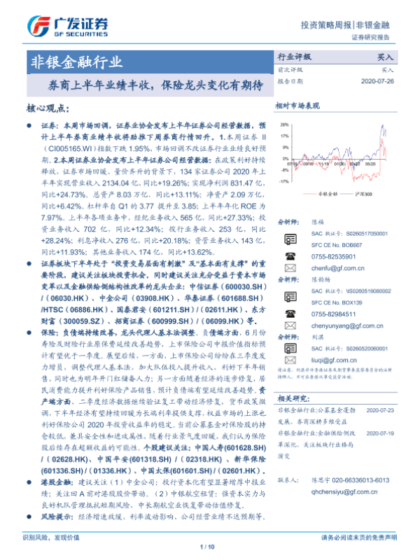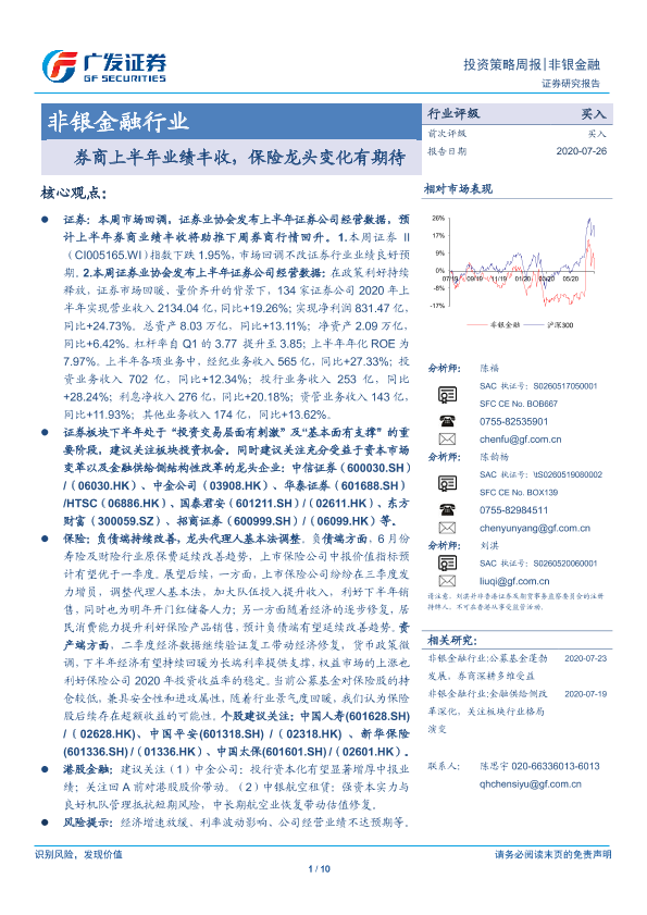 【广发证券】【20200726】非银金融行业投资策略周报:券商上半年业绩丰收,保险龙头变化有期待-10页