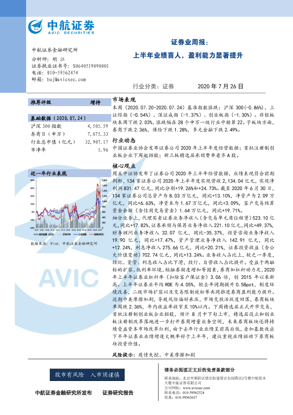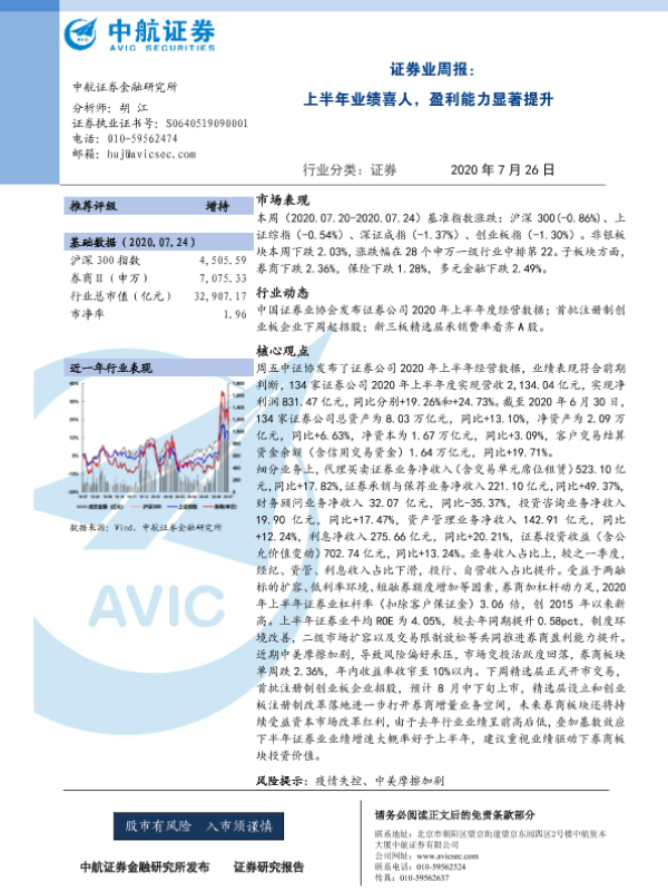 【中航证券】【20200726】证券业周报:上半年业绩喜人,盈利能力显著提升-12页