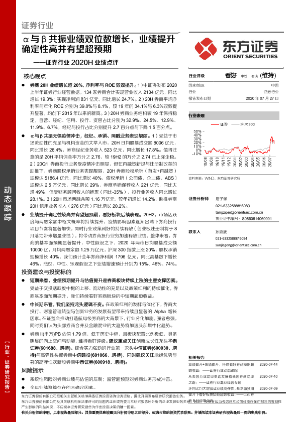 【东方证券】【20200727】证券行业2020H业绩点评:α与β共振业绩双位数增长,业绩提升确定性高并有望超预期-6页