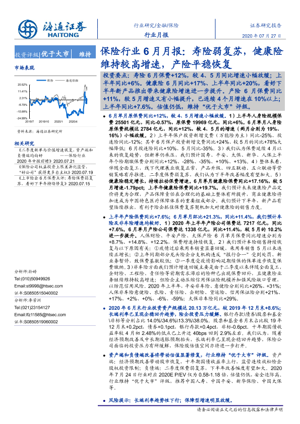 【海通证券】【20200727】保险行业6月月报:寿险弱复苏,健康险维持较高增速,产险平稳恢复-5页