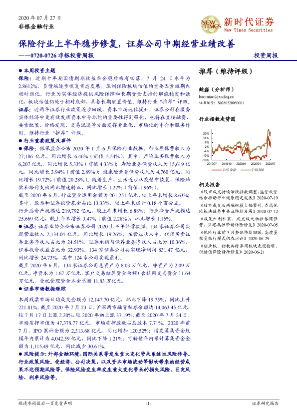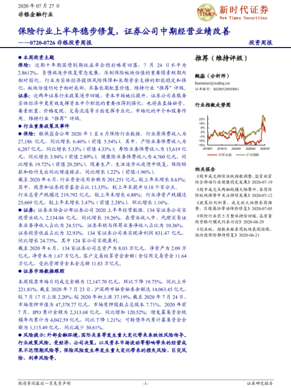 【新时代证券】【20200727】非银投资周报:保险行业上半年稳步修复,证券公司中期经营业绩改善-14页