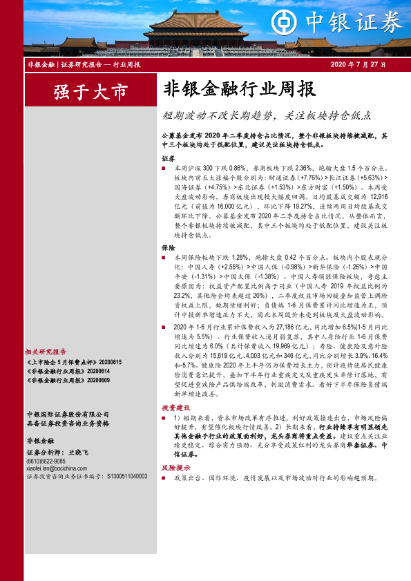【中银证券】【20200727】非银金融行业周报:短期波动不改长期趋势,关注板块持仓低点-10页