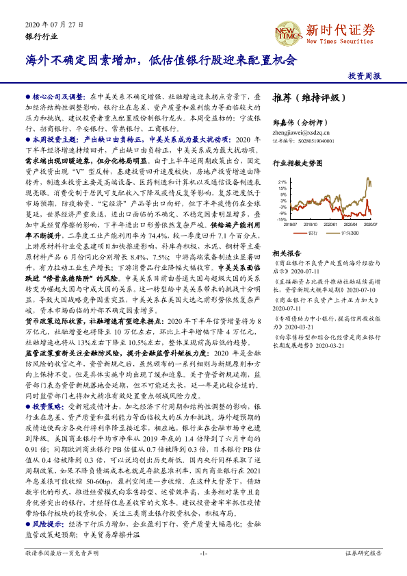 【新时代证券】【20200727】海外不确定因素增加,低估值银行股迎来配置机会-17页