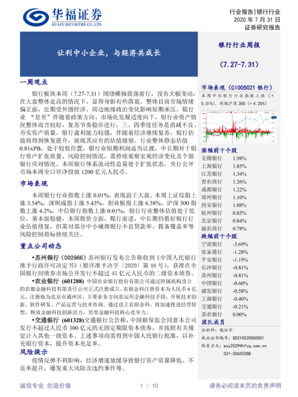 【华福证券】【20200731】银行行业周报:让利中小企业,与经济共成长-10页