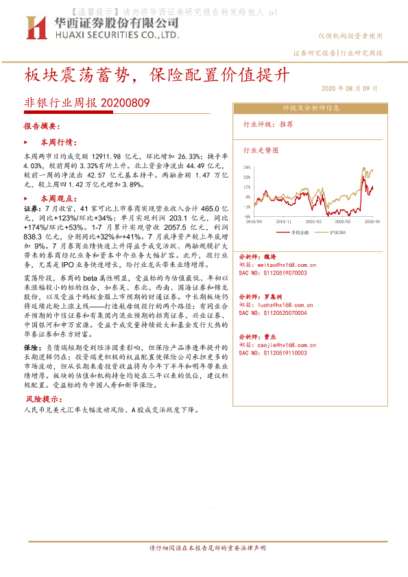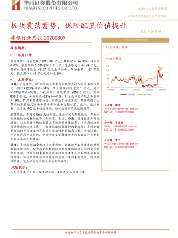 【华西证券】【20200809】非银行业周报:板块震荡蓄势,保险配置价值提升-13页