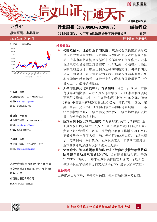 【山西证券】【20200809】证券行业周报:7月业绩爆发,关注市场活跃度提升下的证券板块-9页